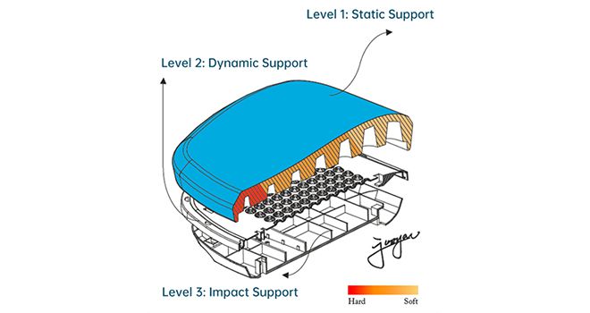 Stufe 1: Die Größenverteilung der konischen Löcher sorgt für unterschiedliche Härteunterstützung in der Sitzsituation. Stufe 2: Der Stützpunkt bietet unterschiedlichen Puffer in der Verdrehungssituation. Stufe 3: Die Lücke zwischen den Zwischenräumen bietet Kissenunterstützung bei dynamischem Aufprall.